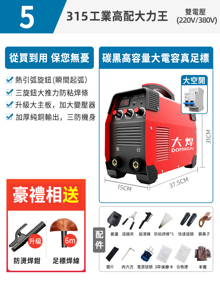 2分鐘前業內焊機領軍品牌【德國DOMHOAI】全新二代數字化電焊機,瞬間起弧,長焊4.0焊條 - 【315-220V/380V】智慧全電壓多板機+2米接地線+4米焊把線+大禮包
