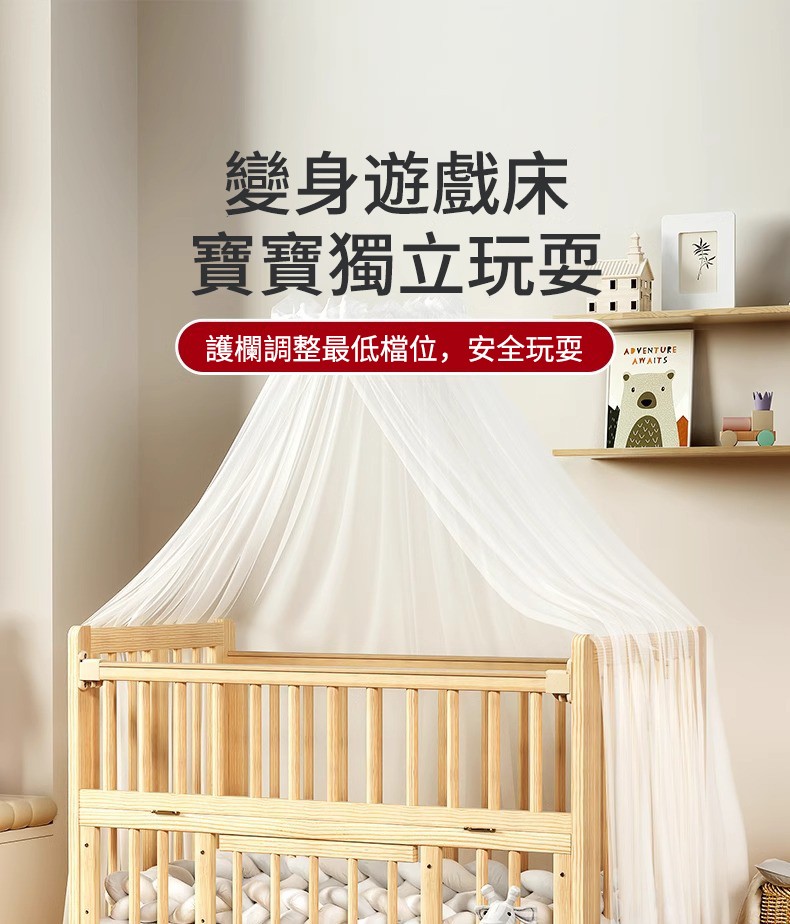 11分鐘前陪伴寶寶成長,永不閒置【嬰兒床-->遊戲床-->書桌】日本超火の可折疊嬰兒床,實木無漆更安心,可拼接大床+滑輪移動,多功能設計陪寶寶成長! - 【118*68*85cm】折疊大床+蚊帳