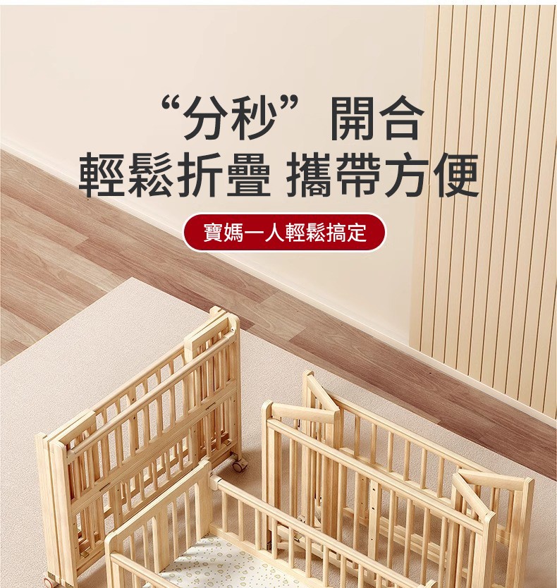 7分鐘前陪伴寶寶成長,永不閒置【嬰兒床-->遊戲床-->書桌】日本超火の可折疊嬰兒床,實木無漆更安心,可拼接大床+滑輪移動,多功能設計陪寶寶成長! - 【118*68*85cm】折疊大床+五件套+蚊帳