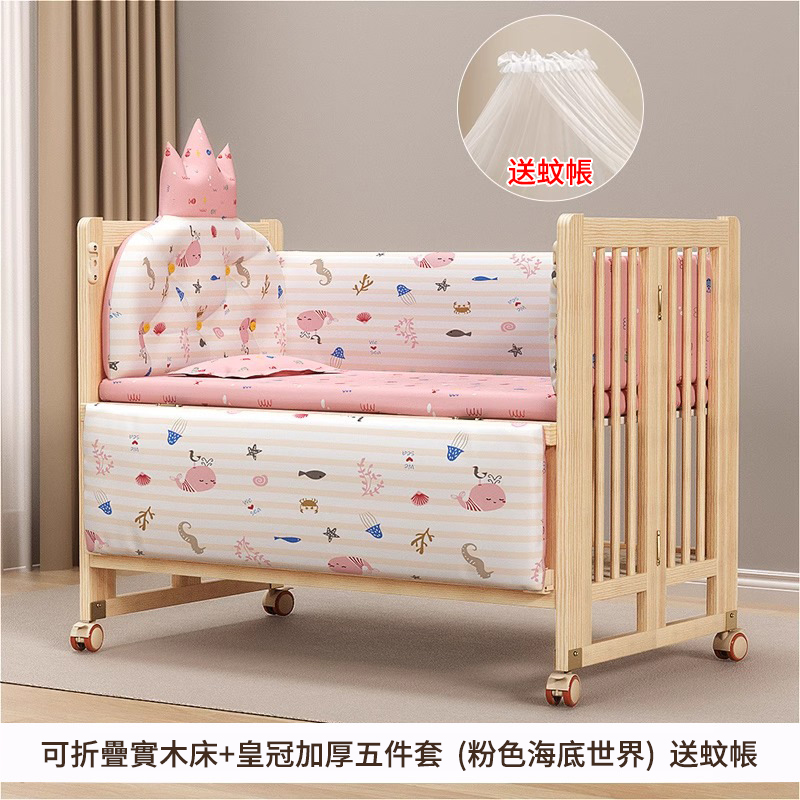 半小時前陪伴寶寶成長,永不閒置【嬰兒床-->遊戲床-->書桌】日本超火の可折疊嬰兒床,實木無漆更安心,可拼接大床+滑輪移動,多功能設計陪寶寶成長! - 【103*61*85cm】折疊小床+五件套+棕墊+蚊帳